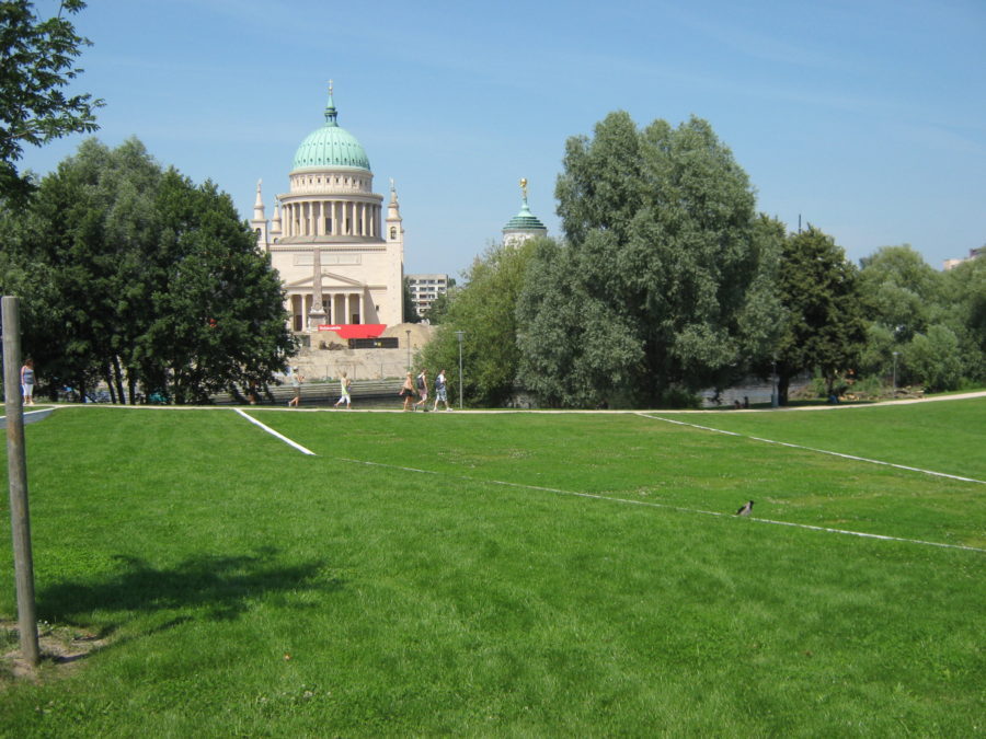 Hinter Sacrow wird die Tour ungemütlich, sobald wir entlang des Jungfern-, des Lehnitz- und des Krampnitzsees die Bundesstraße B2 erreicht haben. Hier müssen wir entlang der viel befahrenen Straße fahren – einen Radweg gibt es nicht – und die Ortschaft Neufahrland durchqueren. Unglücklicherweise haben wir auch noch das Hinweisschild auf den Berliner Mauerweg verfehlt, sodass wir bis in die Potsdamer City bzw. bis zum Potsdamer Hauptbahnhof mitten durch den dicken Verkehr sausten.