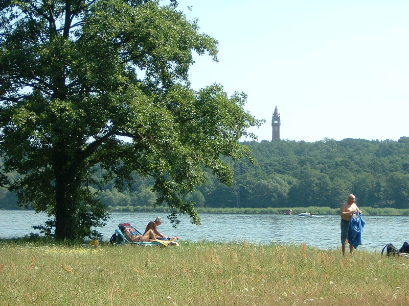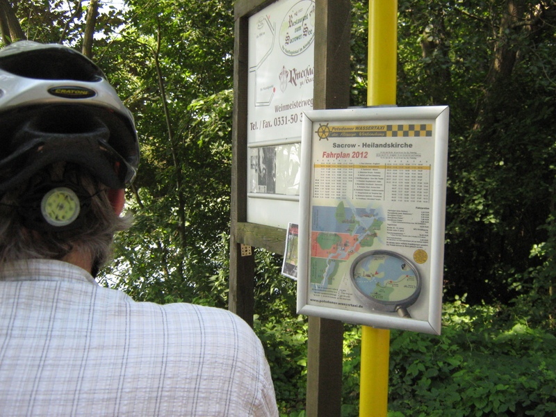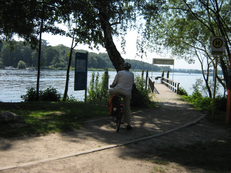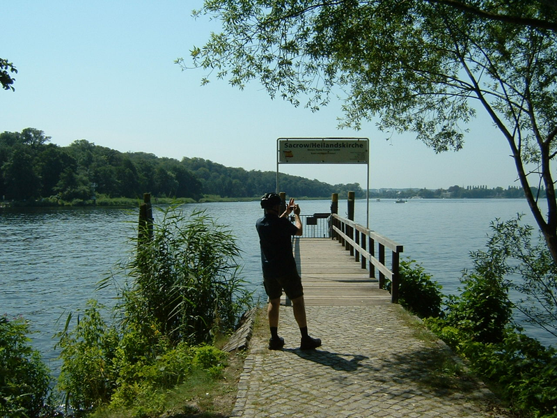 Mit dem Überqueren der Heerstraße fuhren wir in den Ortsteil Gatow ein und begaben uns hier auf den Havelradweg nach Süden. Man fährt auf stillen Vorortstraßen immer dicht an der Havel entlang und bekommt sie auch manchmal zu Gesicht. Nach einem kurzen Stück auf der von Autos belebten Gatower Straße wendet man sich wieder nach Osten, um auf der Uferpromenade gemütlich bis zum Gutspark Neukladow zu radeln. Kurz darauf erreichen wir den Kladower Hafen, an dem sich auch die Anlegestelle der BVG-Fähre F10 befindet. Nach einem guten Kilometer verlassen wir Berlin und fahren nach Sacrow mit seinem Schloss und der Heilandskirche.